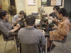 作業を終えての深夜食。昨日は素麺with揚げたて天麩羅。氷水に放った冷やし素麺は見た目からして涼をとれて夏には重宝ですけど昼間残暑厳しいといえど夜更けはすっかり秋めいて、ちと?なメニューですが連日の夜なべ作業。食ったら寝るだけの疲れた胃に優しいもの。。ウドンにしようかな?と思ったけど、PITは暑く皆さん小汗かいてましたんで晩夏の食い納めということで。。薬味は生姜と刻み大葉どっちも健胃剤だしぃ海老、ささみ、茄子、帆立、海苔、インゲンは中高年(A山サン、N爺、髭)に配慮のキャノラー油揚げ。熱々を召し上がれ。追加ドンドン揚げてますけん。勿論白P君にはチン飯お持ちしますよ〜。素麺は1人/3.5束で御用意してます!ワンコそばの様に器が空く度に追加麺を投入される恵比寿飯のシステムに不慣れなA山サンは引き気味でありました。慣れて下さいな&も少し太りなさいっ!