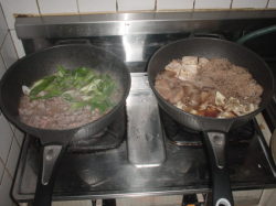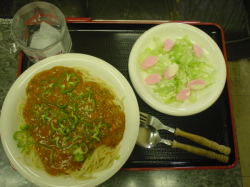 米が底僅かになってたのは承知してたのだけど、事故米騒ぎでナンなんだっ!って怒ってるうちに買い忘れの底付きました。。げっ。。米無い!予定の献立からズレますが慌てない慌てない。ってことで★スパゲティミートソース=ハンバーグの予定だったので挽肉、玉ねぎ微塵切りok.人参、ピーマンも微塵切り。オリーブオイルでガーリックエキス抽出後、各炒める。軽味付、小麦粉塗してさらに炒める。トマトジュース投入!ブイヨン&ハーブ投入!ワイン投入。煮詰める。味調える。以上やる事無し。あとはーー、パスタ湯掻くだけ。7分なので顔揃ってからでいいや。。イタ飯って。。。。ワンディッシュのみなら御手軽すぎ。