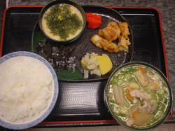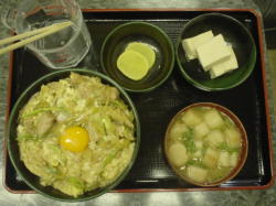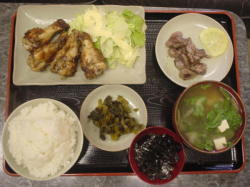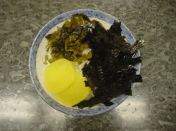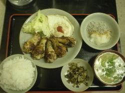 連チャンの寝不足と前日食わず寝ずで朝からめまいに気付にワインを呷った母は撤収時より意識不明の寝たきりババァ。翌定休日も終日寝てました。。情けない。。既に出発前からボケボケでタコヤキのネタと具の配分もバラバラ、やたらタコブツ余りまくりでランチに流用。。★タコの唐揚げ ★シソの胡麻油醤油漬 ★炒り卵とキャベツのサラダ ★もみ海苔 ★ネギとワカメの味噌汁&沢庵
