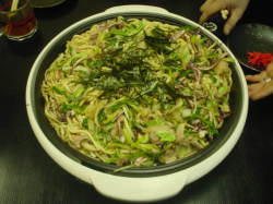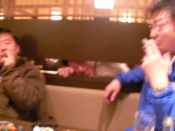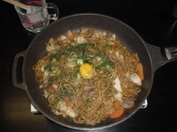 連日の日付越え作業で寝不足一同。。A山サンもN爺も髭に比べりゃ若いつーても中年期、流石に目元に疲れが滲んでまっせ。。な中、白P君はやはりお若い!天晴れ20代、お肌の張りも胃腸の具合も絶好調なようで、ホットプレートではスペース無理な皆の1.5倍サイズのフライパンで別焼したのを着々と喰い、飯食いなので「昼の残り飯ならあるで〜」な母の誘惑に悩み中。。どうやら白飯×お好み焼×コーラ!は太るっと我慢してる模様。しかし終盤「やっぱり御飯ください」だと。若人よ、食えるうちに食っとけ。一応オッサン達にも、米、食うかと訊ねましたが一同ブンブンと首横振る。だよね。。