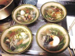 マツタケの料理法、数々あれど。母が一番好きなんは土瓶蒸し。スダチを絞った出汁を頂きつつマツタケを食む、、歯ごたえ。ほんで人肌燗酒、たまらんっ!! ランチで燗酒の出る筈も無く。。大好きな土瓶蒸しに近い状態で料理。>>★松茸土鍋うどん=昆布これでもか〜ほど奮発してカツオは減らしとこ。塩、微・微・醤油で整えたダシで鳥のネック、玉子豆腐、うどん、1煮立ち。松茸投入、三つ葉投入。スダチのスライスを浮かべて食す〜〜日本の秋じゃぁあ〜〜〜 ★御飯の友3種=昆布の佃煮・沢庵・カリカリ梅とシソとオカカのふりかけ