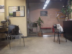 日本は地震列島でありますから、万が一に備えて日頃よりの訓練が大事ですっ! とゆー事で避難訓練の画です。グラッと来たら丈夫な物の下に潜り込んで身を守りましょう。猫用ロールケージなんちゃって。。チェアの脚部なり。